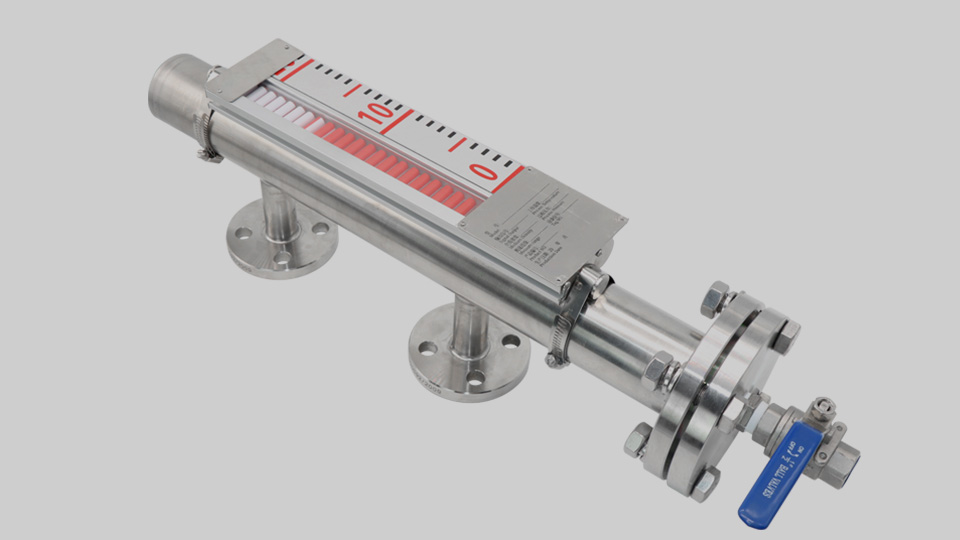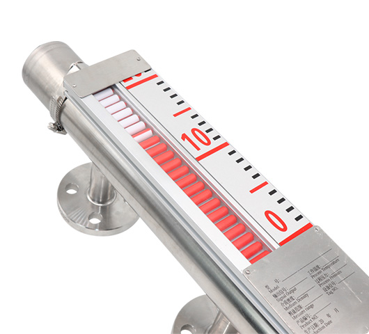 液位計根據浮力原理,浮子在測量管內隨液位的升降而上下移動,浮子內的永久磁鋼通過磁合作用,驅動紅、白色翻柱翻轉180液位上升時,翻柱由白色轉為紅色,下降時,翻柱由紅色轉為白色,從而實現液位的指示。